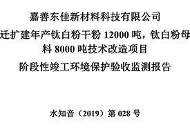 公?? 示??? 根據(jù)《國務院關于修改〈建設項目竣工環(huán)境保護管理條例〉的決定》(國務院令第682號),以及環(huán)保部《關于發(fā)布的公告》(國環(huán)規(guī)環(huán)評[2017]4號),現(xiàn)將嘉善東佳新材料科技有限公司遷擴建年產(chǎn)鈦白粉干粉12000噸,鈦白粉母料8000噸技術改造項目階段性竣工環(huán)境保護